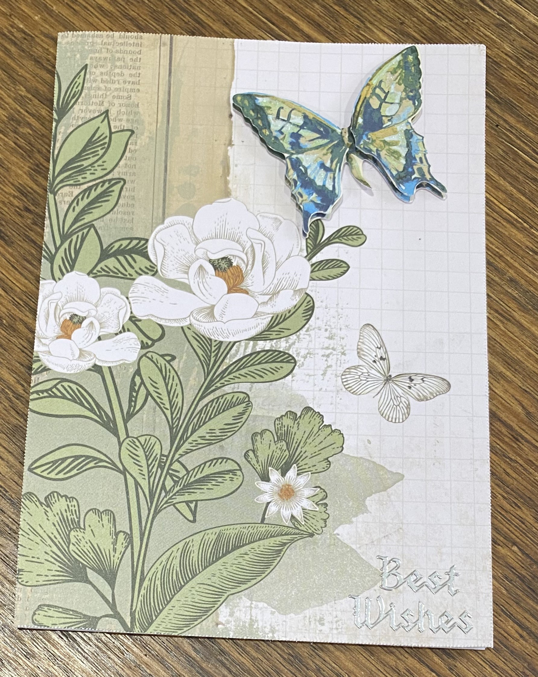 White base card with floral patterned paper, Best Wishes wording in silver and a 3D butterfly decal. Use for a birthday or any other occasion where you want to wish someone well. Card comes in a plastic sleeve for protection when posted to you.