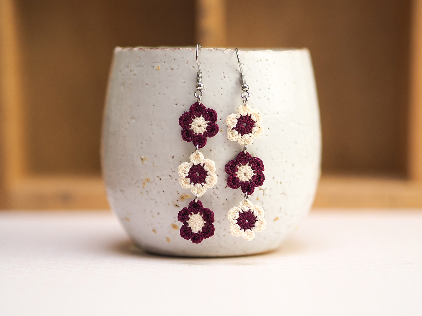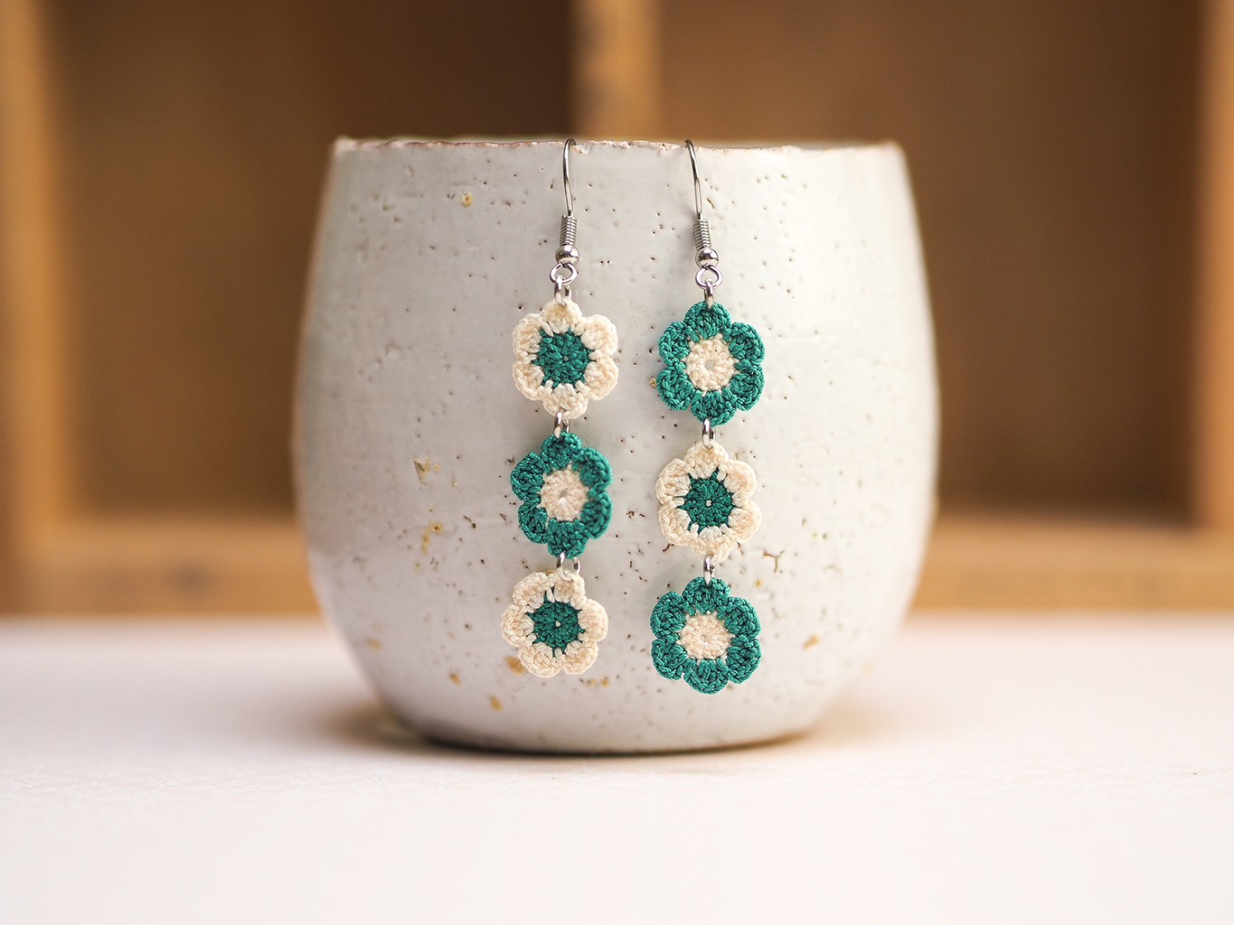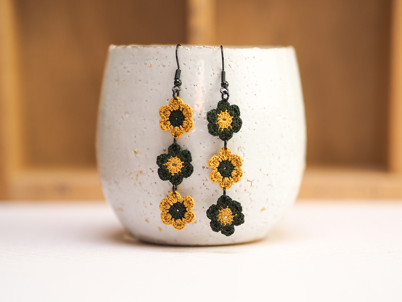 Chain of daisies micro-crochet earrings – 3 daisies – alternating colours
