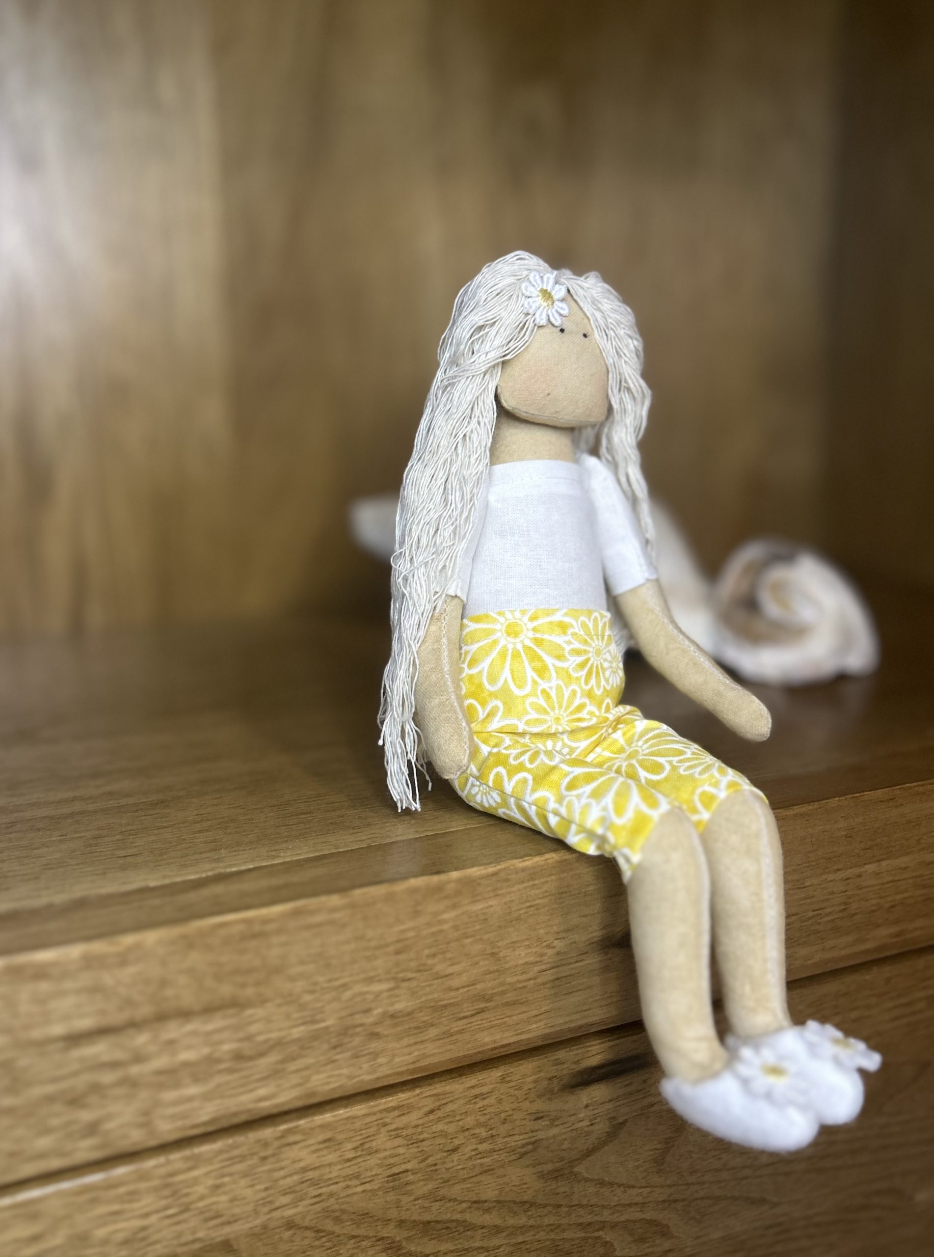 “Evie” is a beautiful handmade sitting fabric doll and is the perfect addition to any bedroom or nursery decor.