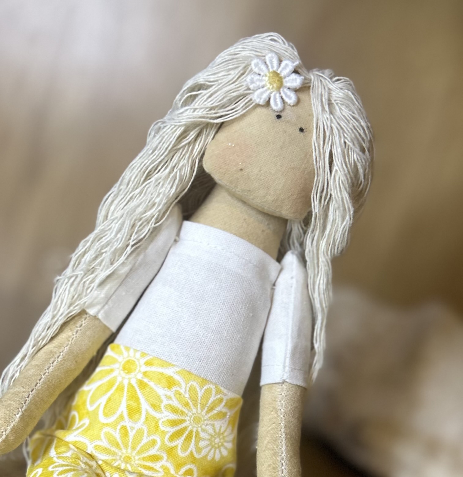 She is handcrafted using a range of complimentary, quality fabrics, including 100% cotton and polyester. Her body is naturally dyed using coffee to give her a warm glow, and her stylish hair is made using new high quality natural recycled macrame cord.