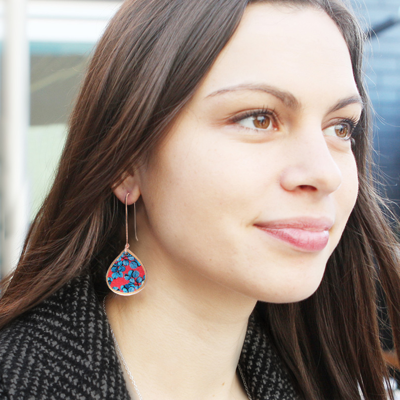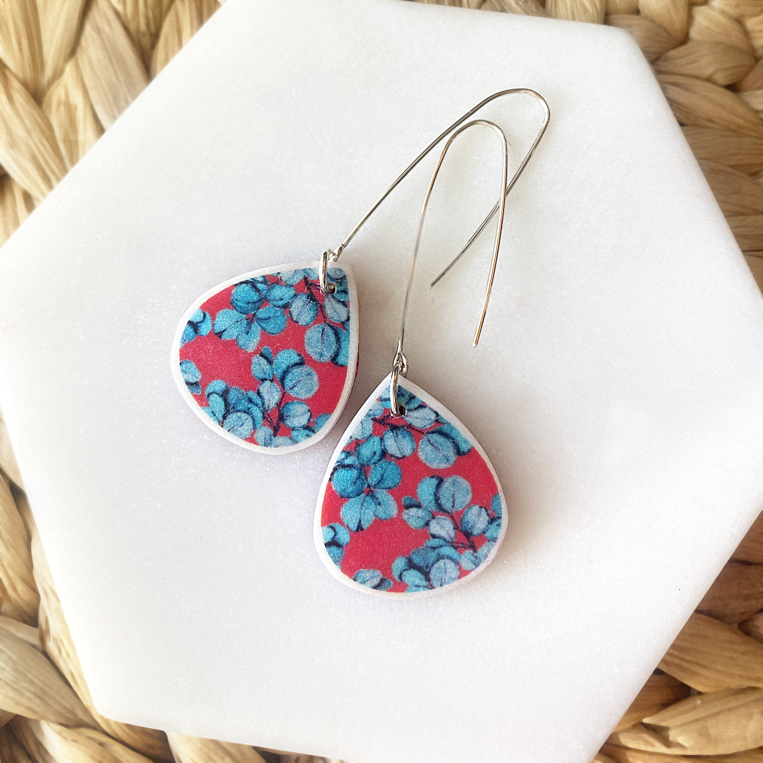 Blue Gum Eucalyptus long hook earrings in red