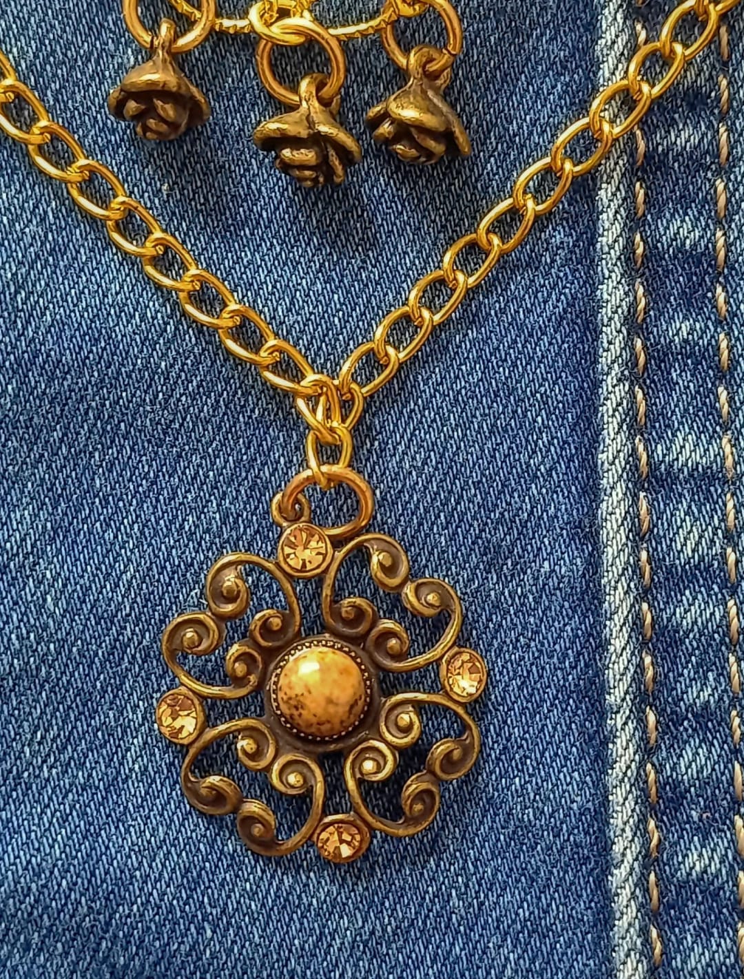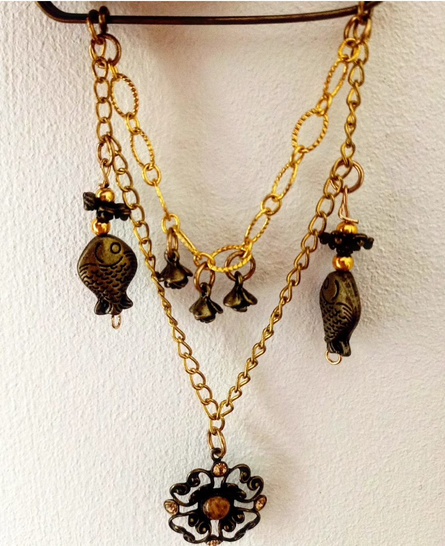 Made from metal acrylic fish beads, metal rose flower beads and metal charm with a metal chain.