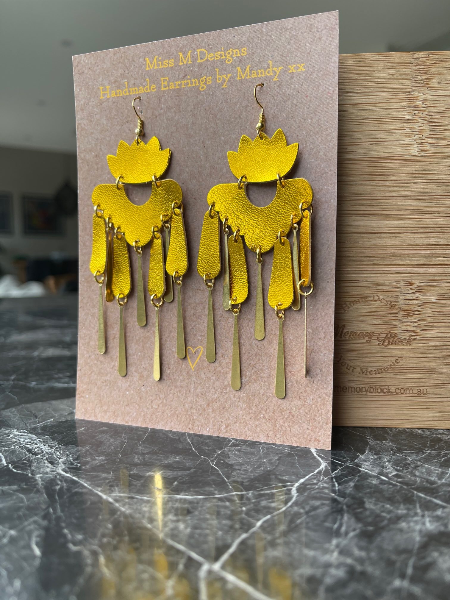 Available in green, yellow & emerald metallic leather and paired with extra long teardrop charms and gold hardware. These are super pretty. Can also be custom made in other colors on request.