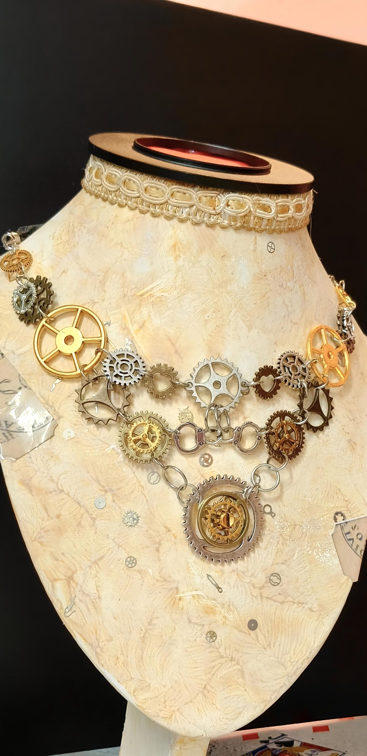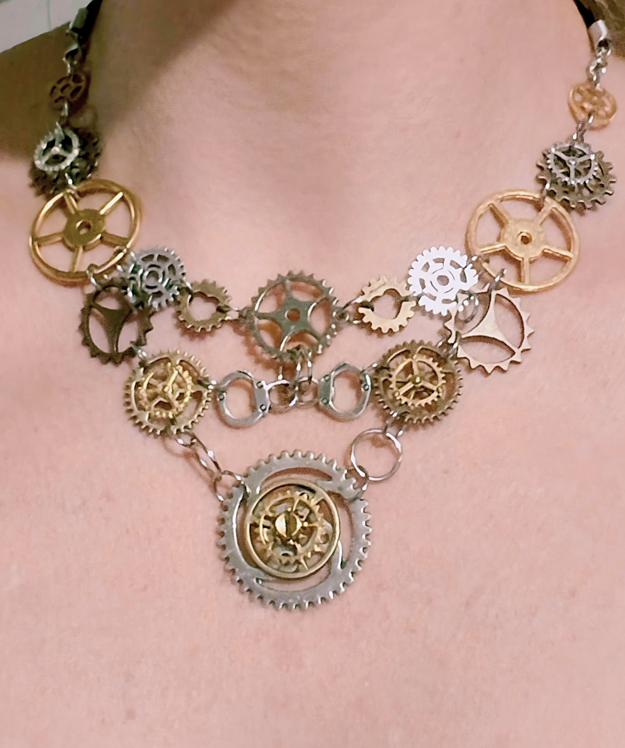 Distinctive Design: A bold centerpiece of layered gears forms a dramatic V shape, creating a stunning focal point for any outfit.