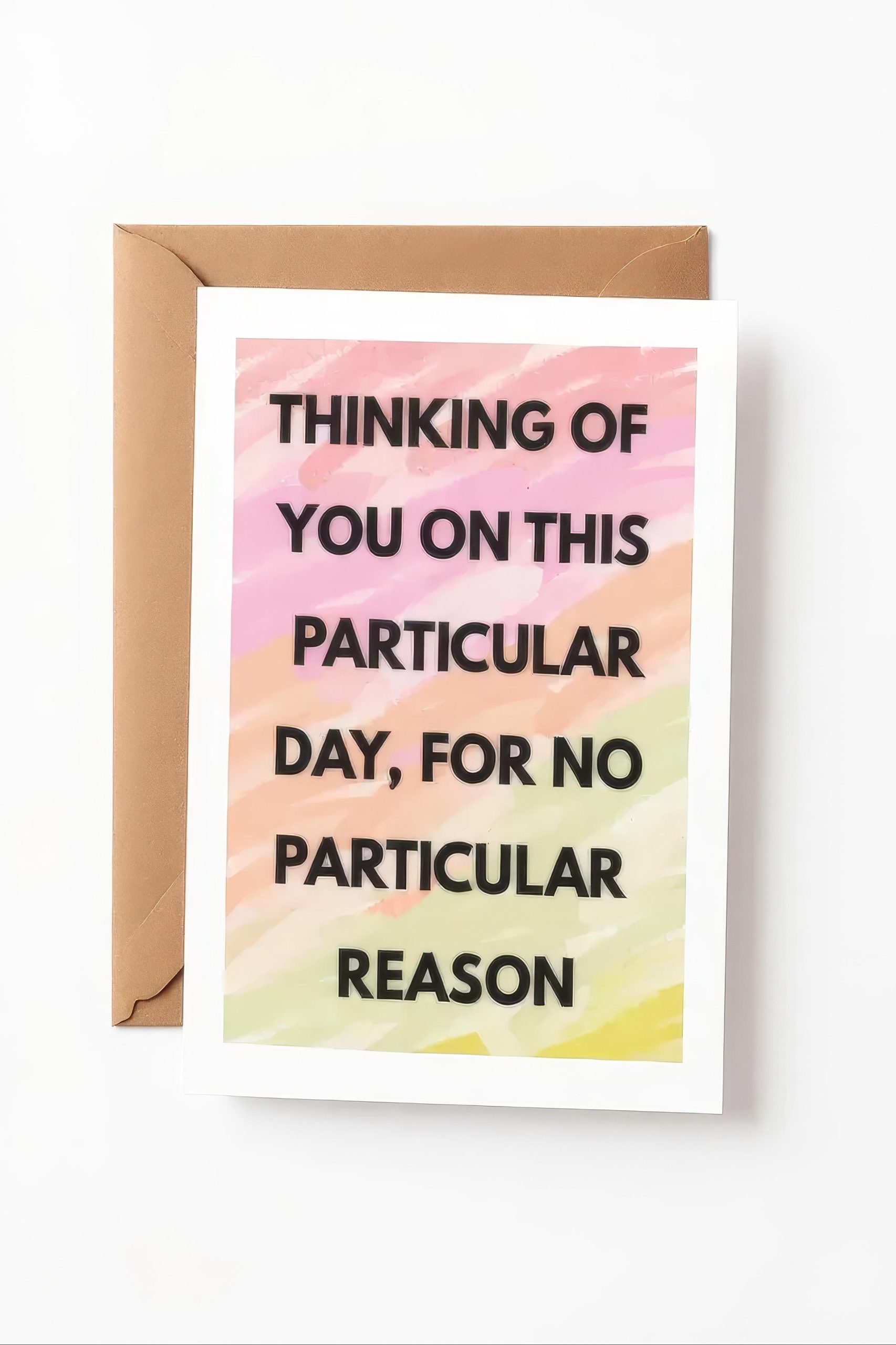Sometimes the best gestures come out of the blue. This card is a cheeky, heartwarming reminder that no occasion is needed to show someone you’re thinking of them — in the most wonderfully random way possible.